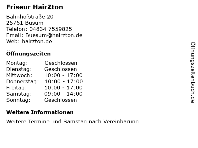 | Öffnungszeiten Friseur HairZton in Büsum anzeigen | |