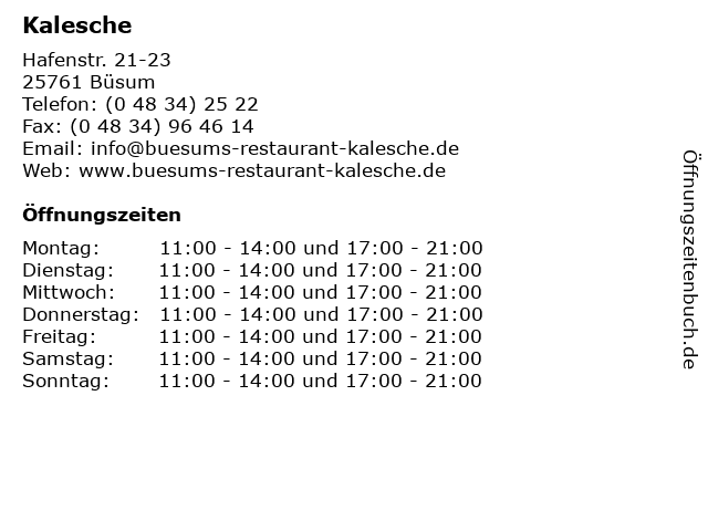 | Öffnungszeiten Kalesche in Büsum anzeigen | |