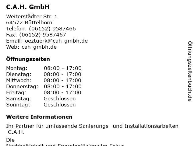 | Öffnungszeiten C.A.H. GmbH in Büttelborn anzeigen | |