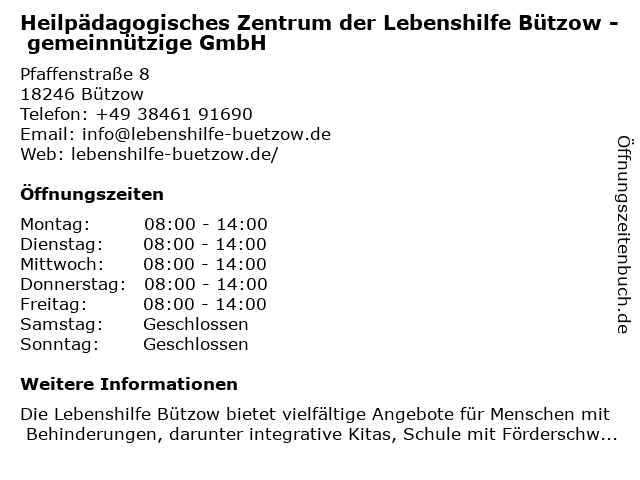 2 Heilpädagogisches Zentrum Lebenshilfe f. Menschen mit geistiger Behinderung e.V. (Entfernung: 1,02 km) Rühner Landweg 25a, 18246 Bützow 4 Wismarer Werkstätten GmbH gemeinnützige Einrichtung für Menschen mit Behinderung (Entfernung: 2,82 km) Nebelring 3, 18246 Bützow 5 6 Lebenshilfe e.V. - Menschen mit Behinderung (Entfernung: 14,64 km) Gustav-Adolf-Straße 8, 18273 Güstrow |