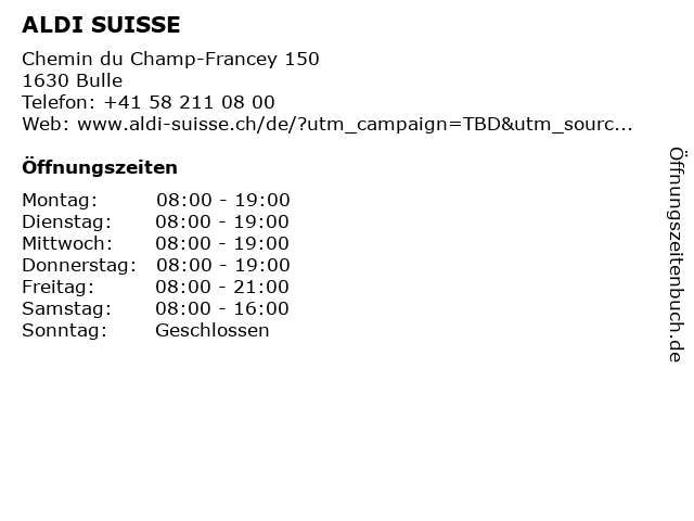 | Öffnungszeiten ALDI SUISSE in Bulle anzeigen | |