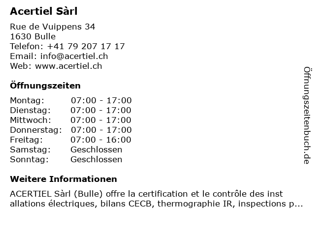 | Öffnungszeiten Acertiel Sàrl in Bulle anzeigen | |