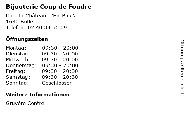 | Öffnungszeiten Bijouterie Coup de Foudre in Bulle anzeigen | |