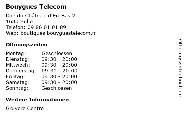 Öffnungszeiten Bouygues Telecom in Bulle anzeigen | |