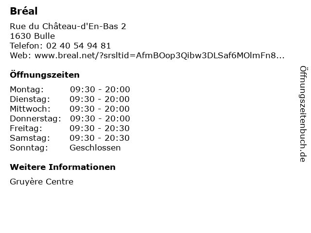 | Öffnungszeiten Bréal in Bulle anzeigen | |