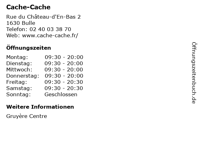 | Öffnungszeiten Cache-Cache in Bulle anzeigen | |