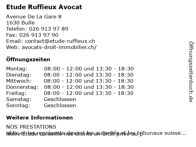 | Öffnungszeiten Etude Ruffieux Avocat in Bulle anzeigen | |