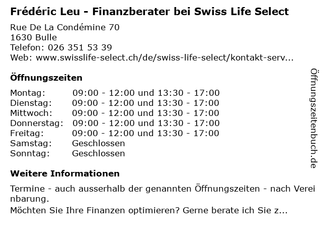 1 Johann Guex - Finanzberater bei Swiss Life Select (Entfernung: 0,00 km) Rue De La Condémine 70, 1630 Bulle 2 Benjamin Tornare - Finanzberater bei Swiss Life Select (Entfernung: 0,00 km) Rue De La Condémine 70, 1630 Bulle 3 Raphaël Battu - Finanzberater bei Swiss Life Select (Entfernung: 0,00 km) Rue De La Condémine 70, 1630 Bulle 4 Hervé Kue Mehebou - Führungskraft bei Swiss Life Select (Entfernung: 0,00 km) Rue De La Condémine 70, 1630 Bulle 5 Emmanuel Mertenat - Finanzberater bei Swiss Life Select (Entfernung: 0,00 km) Rue De La Condémine 70, 1630 Bulle 6 Rudolf Bodmer - Finanzberater bei Swiss Life Select (Entfernung: 0,00 km) Rue De La Condémine 70, 1630 Bulle |