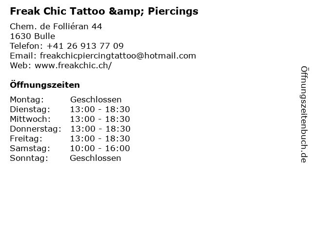 | Öffnungszeiten Freak Chic Tattoo & Piercings in Bulle anzeigen | |