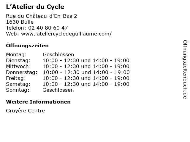 Öffnungszeiten L’Atelier du Cycle in Bulle anzeigen | |
