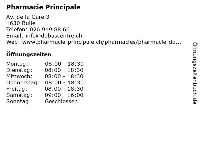 | Öffnungszeiten Pharmacie Principale in Bulle anzeigen | |