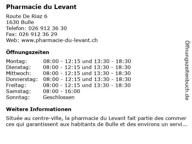 | Öffnungszeiten Pharmacie du Levant in Bulle anzeigen | |