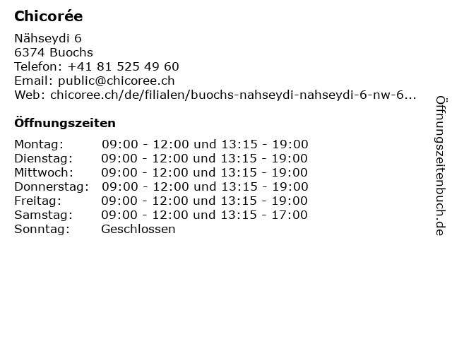 | Öffnungszeiten Chicorée in Buochs anzeigen | |