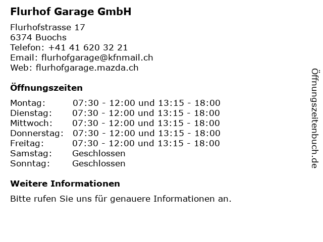 | Öffnungszeiten Flurhof Garage GmbH in Buochs anzeigen | |