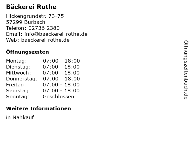 | Öffnungszeiten Bäckerei Rothe in Burbach anzeigen | |