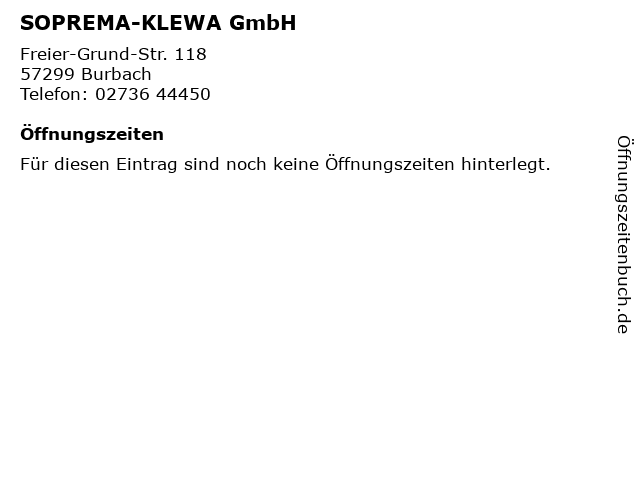 | Öffnungszeiten SOPREMA-KLEWA GmbH in Burbach anzeigen | |