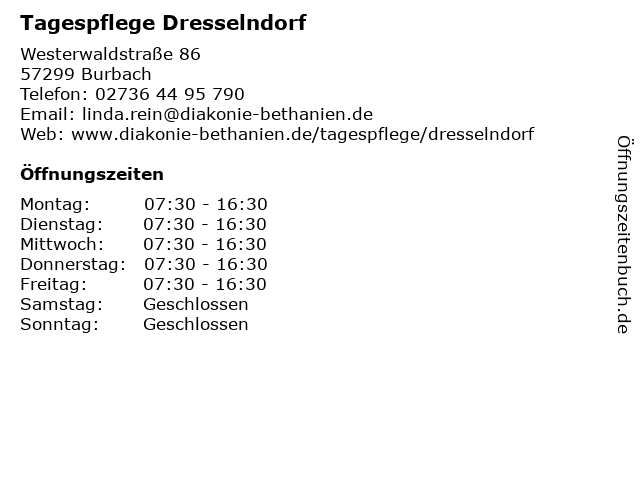 | Öffnungszeiten Tagespflege Dresselndorf in Burbach anzeigen | |