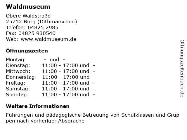 | Öffnungszeiten Waldmuseum in Burg (Dithmarschen) anzeigen | |