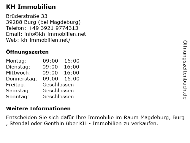 | Öffnungszeiten KH Immobilien in Burg (bei Magdeburg) anzeigen | |
