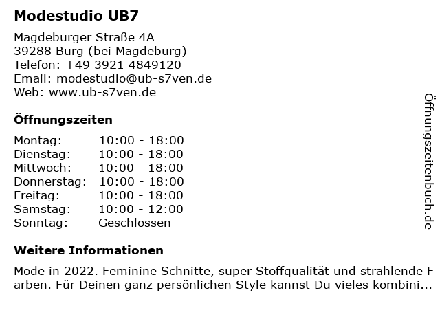 | Öffnungszeiten Modestudio UB7 in Burg (bei Magdeburg) anzeigen | |