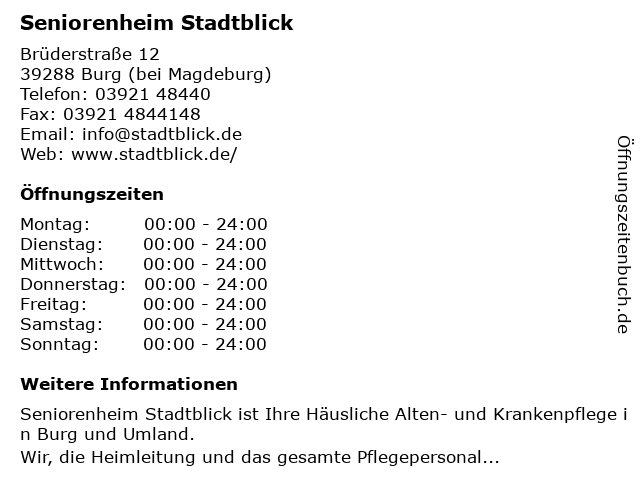 1 H & R Senioren Heimbetriebsgesellschaft mbH & Co.KG Seniorenheim (Entfernung: 1,23 km) In der Alten Kaserne 25, 39288 Burg 6 |