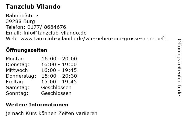 | Öffnungszeiten Tanzclub Vilando in Burg anzeigen | |