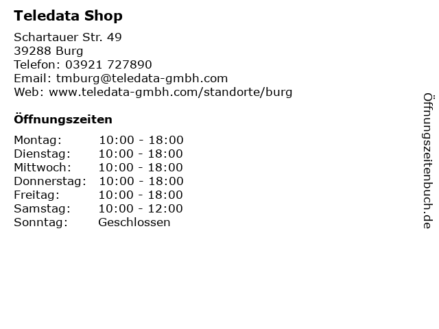 | Öffnungszeiten Teledata Shop in Burg anzeigen | |