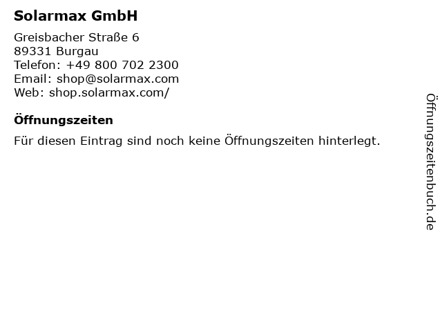 | Öffnungszeiten Solarmax GmbH in Burgau anzeigen | |