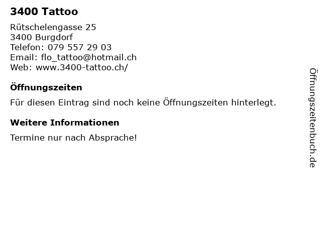 | Öffnungszeiten 3400 Tattoo in Burgdorf anzeigen | |