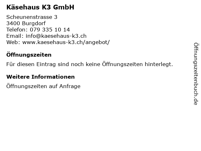 | Öffnungszeiten Käsehaus K3 GmbH in Burgdorf anzeigen | |