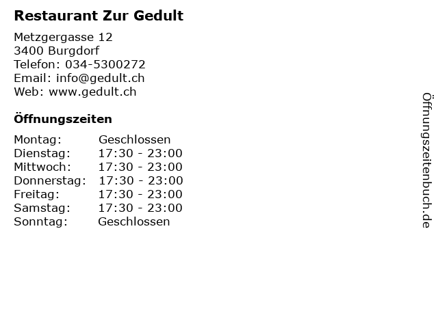 | Öffnungszeiten Restaurant Zur Gedult in Burgdorf anzeigen | |