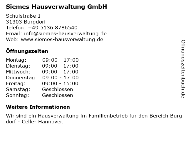 | Öffnungszeiten Siemes Hausverwaltung GmbH in Burgdorf anzeigen | |