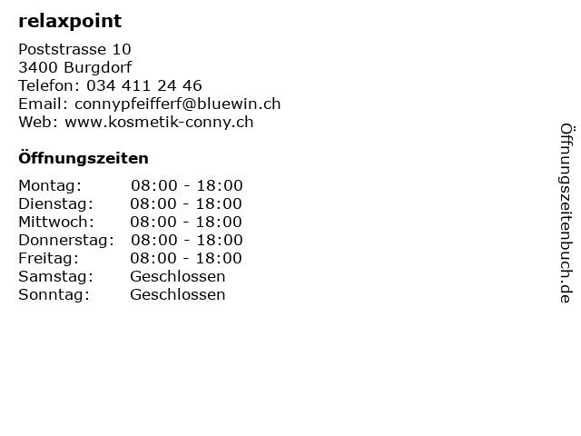 | Öffnungszeiten relaxpoint in Burgdorf anzeigen | |