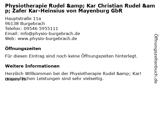 | Physiotherapie Rudel & Kar Christian Rudel & Zafer Kar-Heinsius von Mayenburg GbR anrufen | |