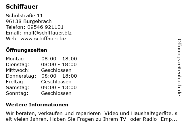 | Öffnungszeiten Schiffauer in Burgebrach anzeigen | |