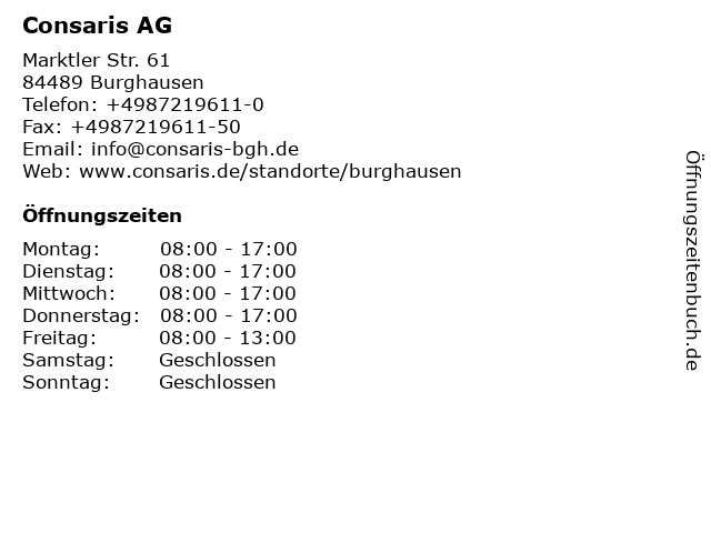 | Öffnungszeiten Consaris AG in Burghausen anzeigen | |