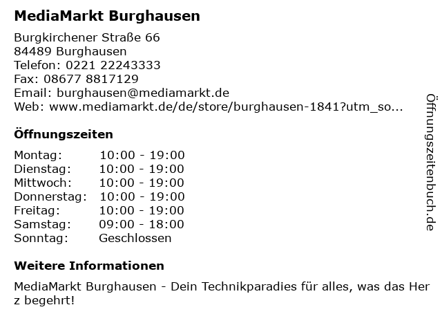 | Öffnungszeiten MediaMarkt Burghausen in Burghausen anzeigen | |