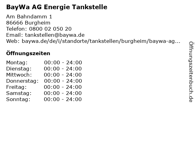| Öffnungszeiten BayWa AG Energie Tankstelle in Burgheim anzeigen | |