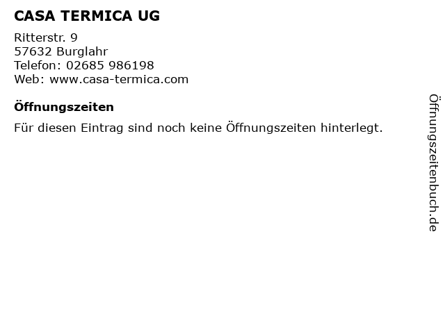 | Öffnungszeiten CASA TERMICA UG in Burglahr anzeigen | |