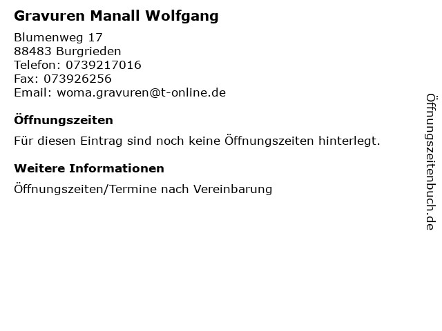 | Öffnungszeiten Gravuren Manall Wolfgang in Burgrieden anzeigen | |