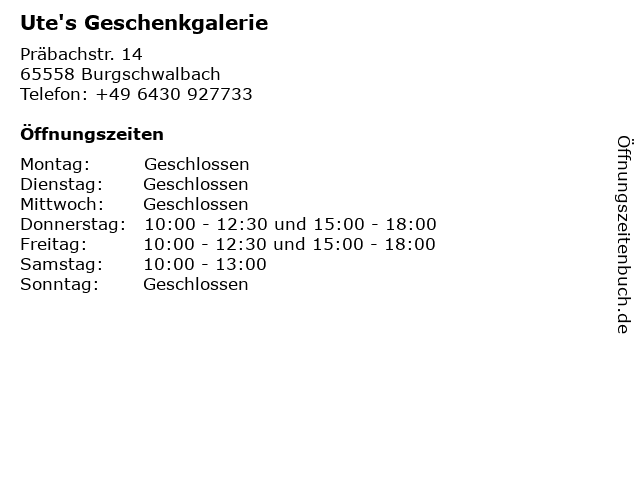 1 Klaus Heil, Ute Installation von Gasheizungen (Entfernung: 10,55 km) Am Berghang 10, 65510 Hünstetten 5 Edgar u. Ute Zanger Landwirtschaftliche Direktvermarktung (Entfernung: 15,04 km) Oberstr. 2, 65594 Runkel 6 Ute Bingel Privatpraxis für Physiotherapie (Entfernung: 15,45 km) Geschwister-Scholl-Str. 67, 65232 Taunusstein |