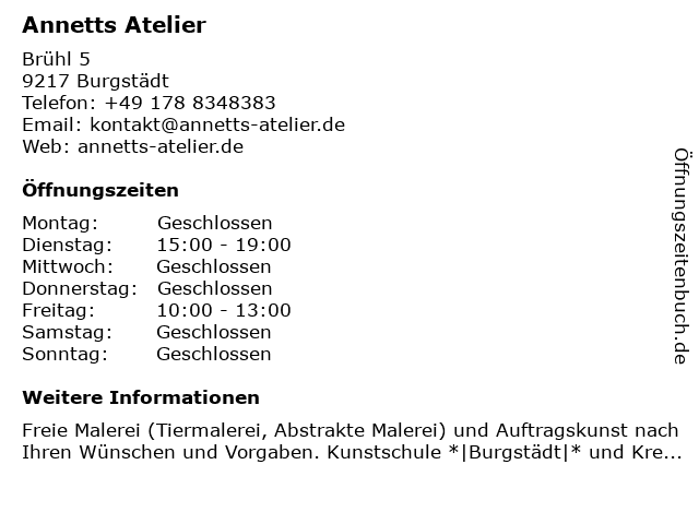 | Öffnungszeiten Annetts Atelier in Burgstädt anzeigen | |