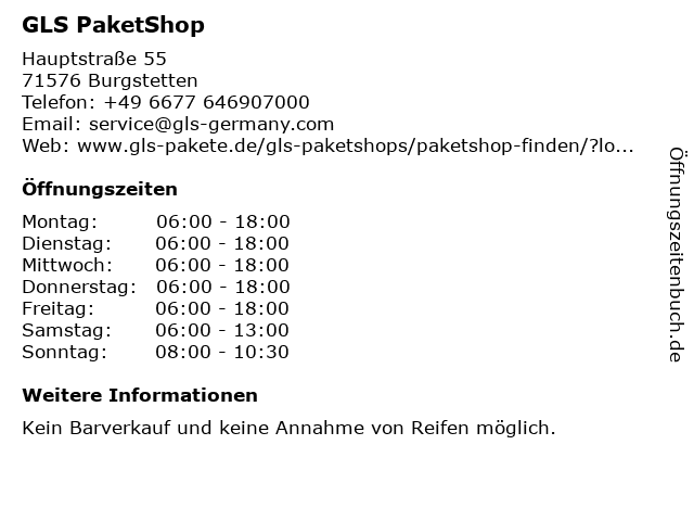 | Öffnungszeiten GLS PaketShop in Burgstetten anzeigen | |