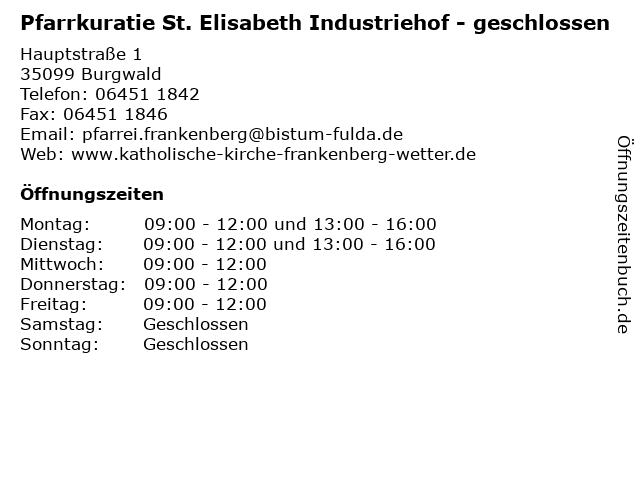 Branchen & Suchbegriffe zu Pfarrkuratie St. Elisabeth Industriehof - geschlossen:elisabeth, geschlossen, industriehof, pfarrkuratie |