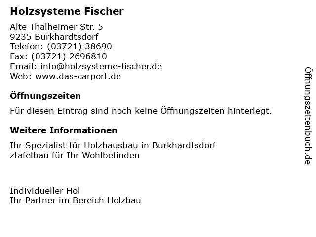 | Öffnungszeiten Holzsysteme Fischer in Burkhardtsdorf anzeigen | |