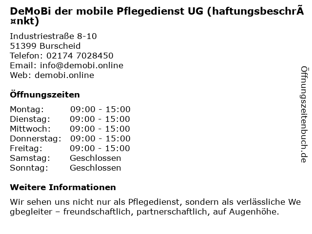 Branchen & Suchbegriffe zu DeMoBi der mobile Pflegedienst UG (haftungsbeschränkt):demobi, haftungsbeschränkt, mobile, pflegedienst, pflegefamilien, ug |