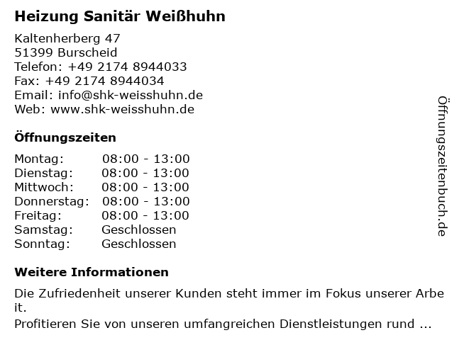 | Öffnungszeiten Heizung Sanitär Weißhuhn in Burscheid anzeigen | |