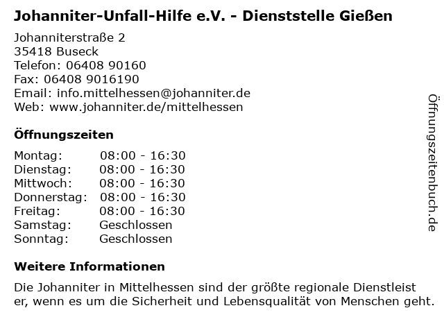 Branchen & Suchbegriffe zu Johanniter-Unfall-Hilfe e.V. - Dienststelle Gießen:dienststelle, e.v., gemeinnützige organisation, hilfe, hilfsorganisation, johanniter, sozialarbeit, unfall, verband, wohlfahrtseinrichtung |