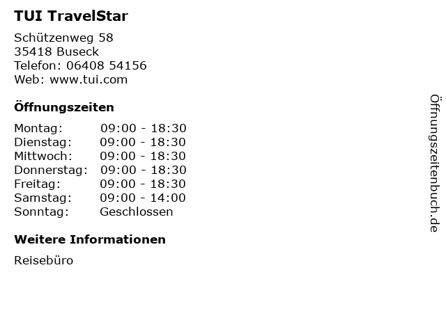 | Öffnungszeiten TUI TravelStar in Buseck anzeigen | |