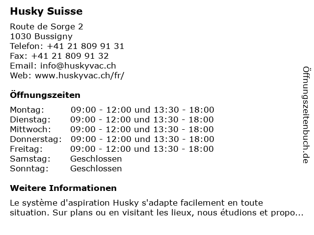 | Öffnungszeiten Husky Suisse in Bussigny anzeigen | |